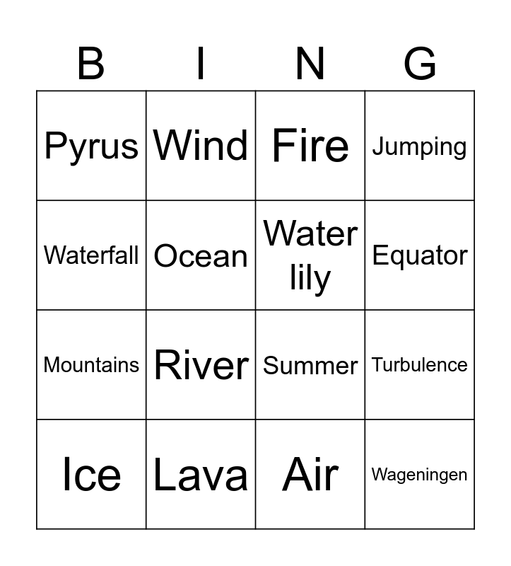 This bingo card has 32 words: Tides, Tsunami, Turbulence, Turn the tide, Wageningen, Water lily, Waterfall, Waves, Wind, Beach, Equator, Fire, Heat Waves, Hurricane, Lava, Sandstorm, Soil, Summer, Sunset, Sunshine, Temperature, Thunder, Air, Avalanche, Ice, Jumping, Mountains, Ocean, Pyrus, Rain, Rainbow and River.