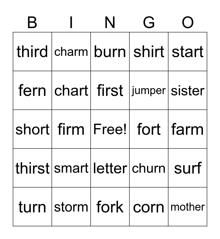 This bingo card has a free space and 24 words: smart, storm, first, turn, start, third, fern, charm, fort, letter, jumper, short, churn, surf, chart, corn, farm, burn, sister, firm, mother, thirst, shirt and fork.