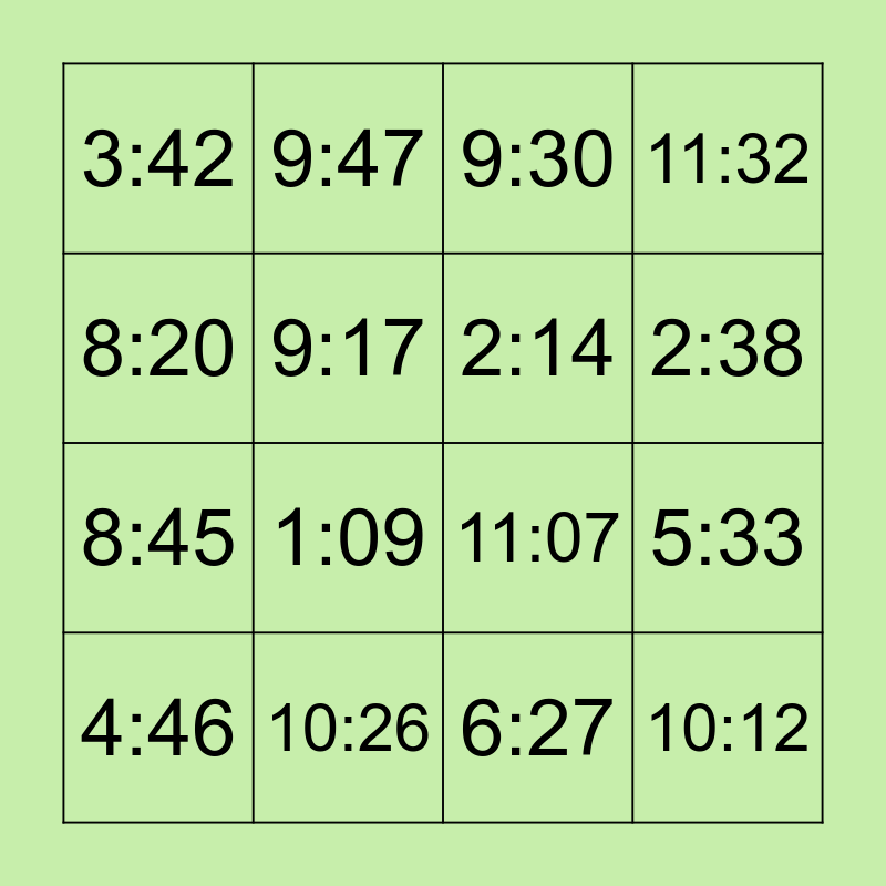 This bingo card has 28 words: 8:03, 8:15, 8:45, 9:08, 9:17, 9:30, 9:47, 10:12, 10:26, 10:53, 11:07, 11:32, 12:16, 12:45, 1:09, 1:25, 1:40, 2:14, 2:38, 3:15, 3:42, 4:18, 4:46, 5:33, 6:27, 7:45, 8:20 and 8:57.