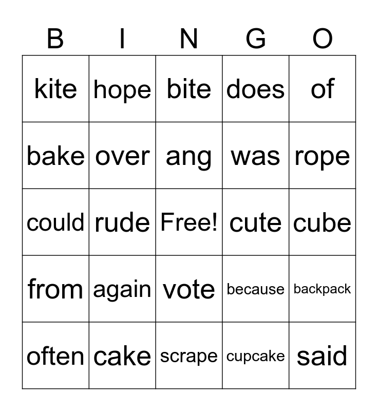 This bingo card has a free space and 24 words: again, cake, ang, often, of, kite, bake, hope, cute, vote, was, could, because, backpack, over, cupcake, cube, bite, rope, rude, said, from, does and scrape.