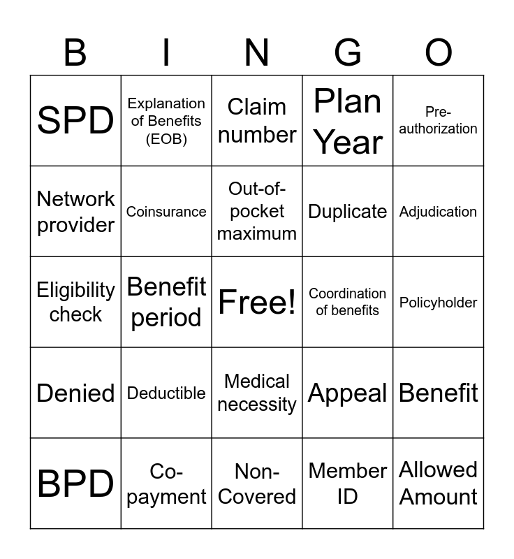 This bingo card has a free space and 24 words: Deductible, Co-payment, Out-of-pocket maximum, BPD, Pre-authorization, SPD, Network provider, Explanation of Benefits (EOB), Coordination of benefits, Medical necessity, Duplicate, Eligibility check, Appeal, Benefit, Coinsurance, Member ID, Policyholder, Claim number, Adjudication, Benefit period, Allowed Amount, Denied, Plan Year and Non-Covered.