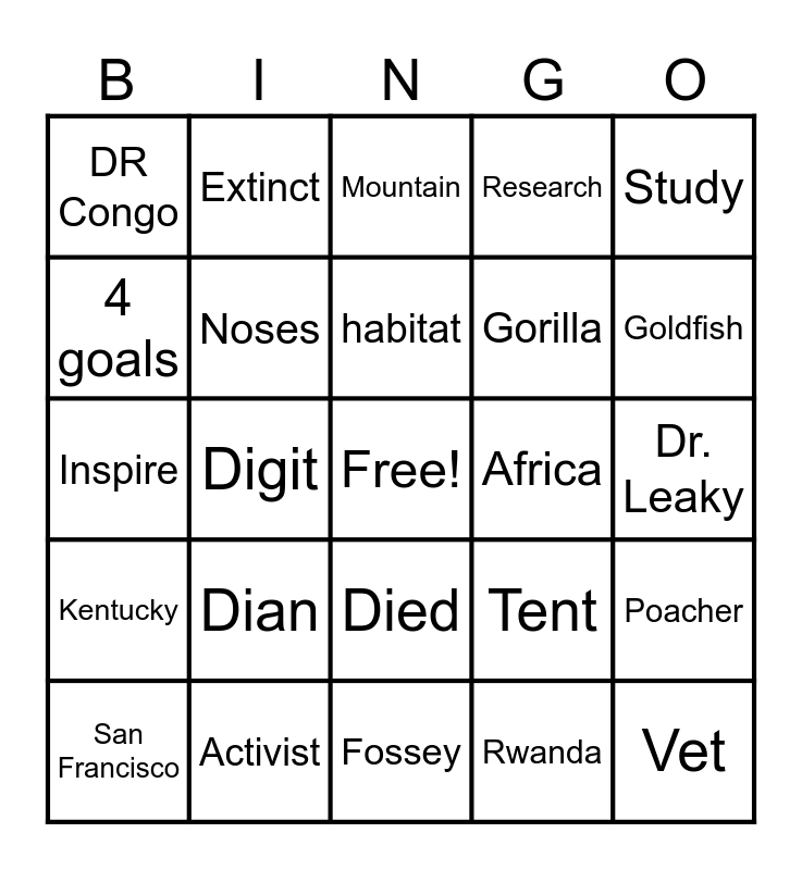 This bingo card has a free space and 24 words: Dian, Activist, habitat, San Francisco, Study, DR Congo, 4 goals, Extinct, Africa, Died, Gorilla, Inspire, Tent, Poacher, Noses, Rwanda, Dr. Leaky, Mountain, Goldfish, Digit, Vet, Kentucky, Research and Fossey.
