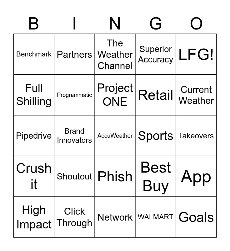 This bingo card has a free space and 24 words: Shoutout, Click Through, Project ONE, High Impact, LFG!, Benchmark, Full Shilling, Partners, Sports, Phish, Retail, Pipedrive, Best Buy, App, Programmatic, WALMART, Takeovers, The Weather Channel, Current Weather, Brand Innovators, Goals, Crush it, Superior Accuracy and Network.