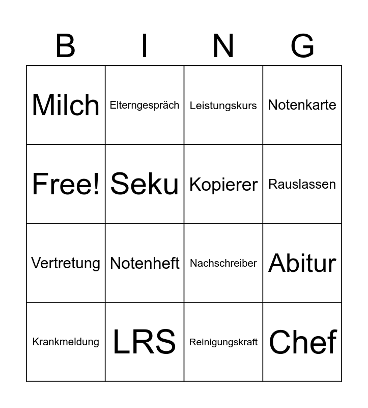 This bingo card has 16 words: LRS, Abitur, Leistungskurs, Milch, Vertretung, Elterngespräch, Nachschreiber, Reinigungskraft, Free!, Seku, Krankmeldung, Notenkarte, Notenheft, Rauslassen, Kopierer and Chef.