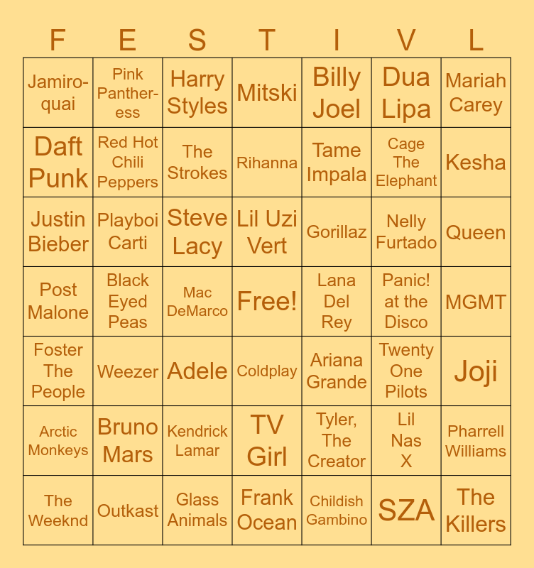 This bingo card has a free space and 48 words: Tyler, The Creator, Cage The Elephant, Frank Ocean, Black Eyed Peas, Steve Lacy, MGMT, Pink Panther-ess, Outkast, Dua Lipa, Coldplay, Mariah Carey, Mitski, Nelly Furtado, Gorillaz, Arctic Monkeys, Panic! at the Disco, Daft Punk, Kesha, Lil Nas X, Billy Joel, Tame Impala, Mac DeMarco, Jamiro-quai, Red Hot Chili Peppers, Pharrell Williams, The Strokes, Queen, The Weeknd, Lil Uzi Vert, Playboi Carti, SZA, Lana Del Rey, Joji, Bruno Mars, Post Malone, Ariana Grande, Twenty One Pilots, Justin Bieber, Adele, Kendrick Lamar, Foster The People, The Killers, Harry Styles, Glass Animals, Rihanna, TV Girl, Weezer and Childish Gambino.