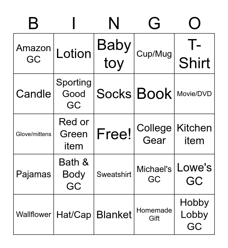 This bingo card has a free space and 29 words: Wallflower, Slipper/shoes, Red or Green item, Tool, Amazon GC, Baby toy, Sporting Good GC, Bath & Body GC, College Gear, Hat/Cap, Kitchen item, Hobby Lobby GC, Blanket, Homemade Gift, Movie/DVD, Soap, Sweatshirt, Pajamas, T-Shirt, Glove/mittens, Michael's GC, Cologne/Perfume, Book, Candle, Cup/Mug, Lotion, Lowe's GC, Socks and Pants/Jeans.