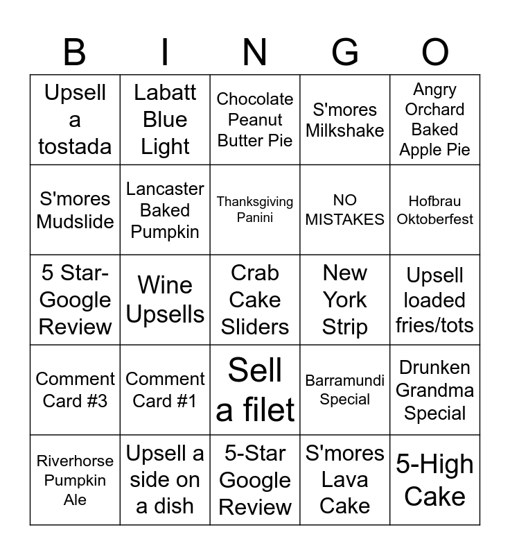 This bingo card has a free space and 24 words: Comment Card #1, Upsell a side on a dish, Thanksgiving Panini, Riverhorse Pumpkin Ale, Angry Orchard Baked Apple Pie, Upsell a tostada, S'mores Mudslide, Labatt Blue Light, New York Strip, Sell a filet, NO MISTAKES, 5 Star-Google Review, Barramundi Special, Drunken Grandma Special, Lancaster Baked Pumpkin, S'mores Lava Cake, Upsell loaded fries/tots, Chocolate Peanut Butter Pie, Hofbrau Oktoberfest, Wine Upsells, 5-High Cake, Comment Card #3, S'mores Milkshake and 5-Star Google Review.