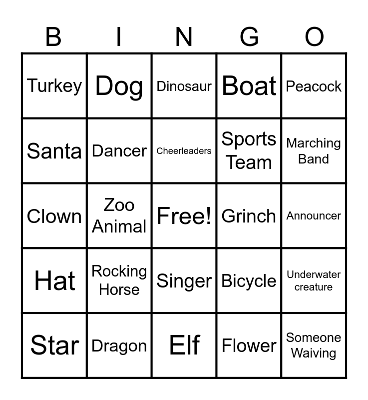 This bingo card has a free space and 28 words: Underwater creature, Cup of Coffee, Sports Team, Flower, Santa, Dinosaur, Dog, Hat, Grinch, Star, Clown, Boat, Dragon, Elf, Marching Band, Mittens, Rocking Horse, Dancer, Cheerleaders, Singer, Turkey, Woodland Creature, Someone Waiving, Zoo Animal, Announcer, Bicycle, Peacock and Book Character.