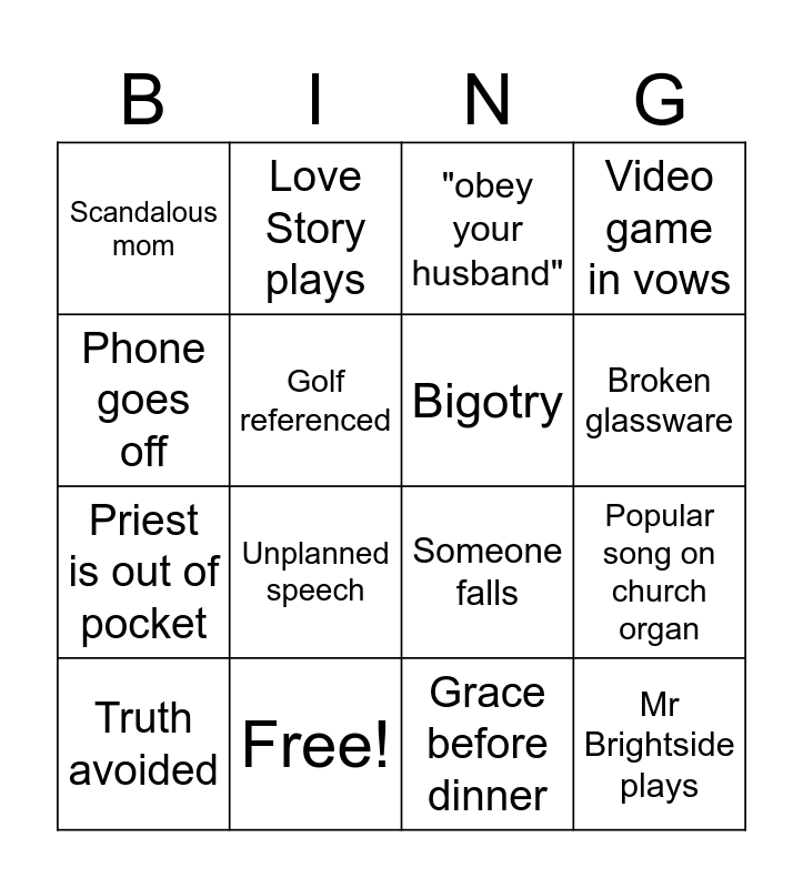 This bingo card has 28 words: Spencer cries, Alex cries, Priest is out of pocket, Baby cries, Golf referenced, "obey your husband", Love Story plays, Mr Brightside plays, Free!, Wardrobe malfuntion, Someone falls, Video game in vows, LOTR in vows, Star wars in vows, Unplanned speech, Election mentioned, Clearly drunk while giving speech, Bigotry, Broken glassware, Scandalous teen, Scandalous mom, Divine intervention, Truth avoided, Popular song on church organ, Grace before dinner, A sinner tries to take communion, Phone goes off and Gun.