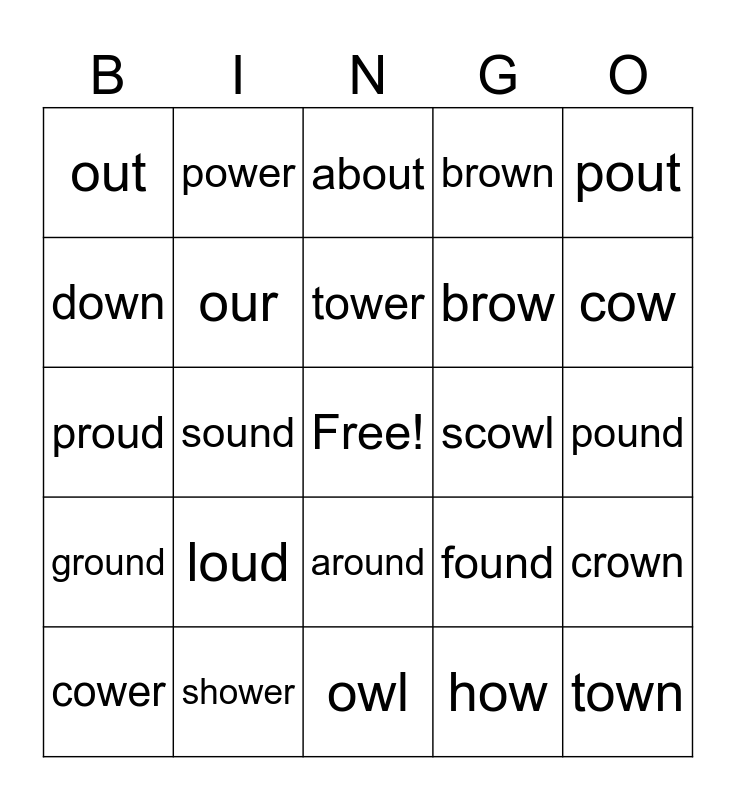 This bingo card has a free space and 28 words: cloud, shower, tower, how, pout, out, our, owl, scowl, crown, proud, sound, found, town, down, mound, around, brown, cow, cower, power, plow, brow, pound, ground, loud, about and shout.