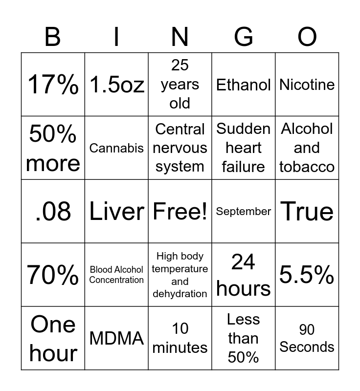 This bingo card has a free space and 29 words: One hour, Naloxone/ Narcan, Liver, 28,000, 17%, 25 years old, Cannabis, Blood Alcohol Concentration, September, MDMA, True, 90 Seconds, 10 minutes, Less than 50%, Alcohol and tobacco, THC, High body temperature and dehydration, 70%, Nicotine, .08, 24 hours, Facial and limb abnormalities, Sudden heart failure, 50% more, Ethanol, 1.5oz, 5.5%, Central nervous system and False.