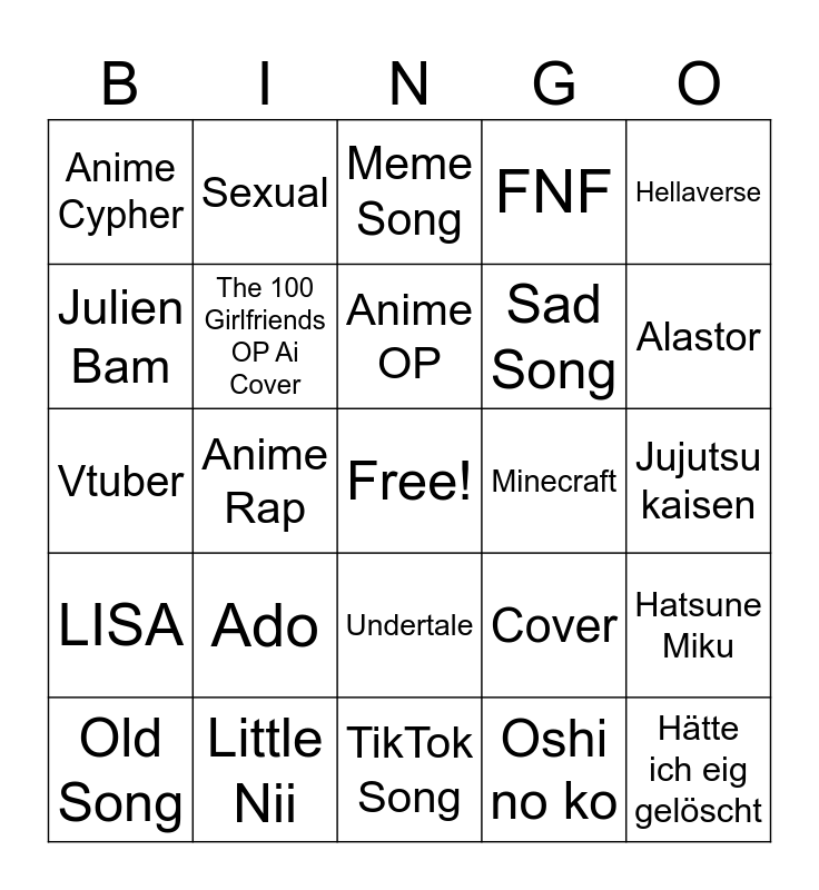 This bingo card has a free space and 24 words: Ado, Little Nii, Anime OP, Old Song, Hellaverse, Anime Cypher, Julien Bam, Sexual, Minecraft, Undertale, Sad Song, Vtuber, Cover, Hatsune Miku, The 100 Girlfriends OP Ai Cover, Oshi no ko, Jujutsu kaisen, Meme Song, Alastor, Anime Rap, Hätte ich eig gelöscht, LISA, FNF and TikTok Song.