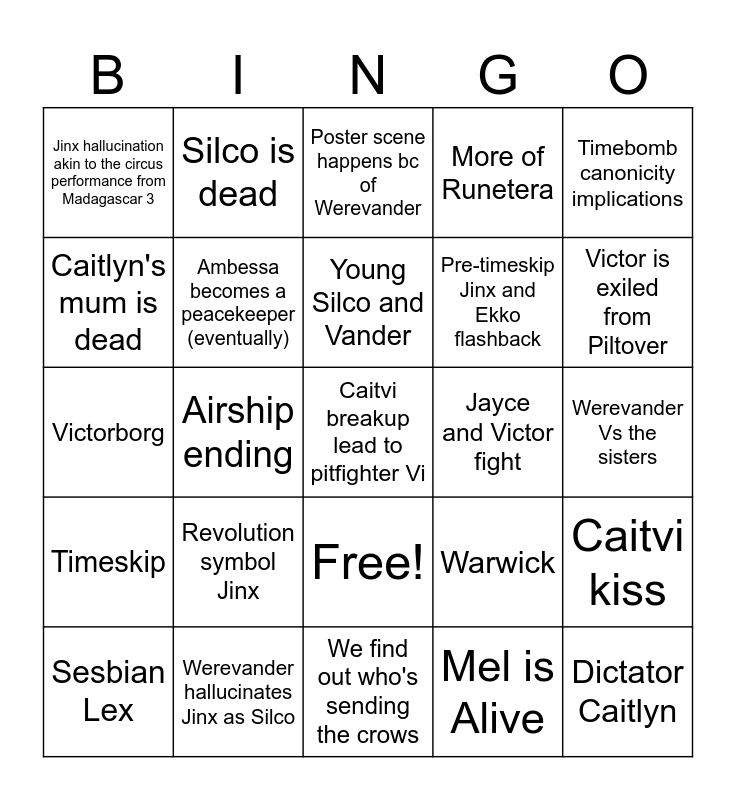 This bingo card has 26 words: Free!, Mel is Alive, Young Silco and Vander, Werevander hallucinates Jinx as Silco, Timebomb canonicity implications, Jinx hallucination akin to the circus performance from Madagascar 3, Caitlyn's mum is dead, Silco is dead, Werevander Vs the sisters, Warwick, Pre-timeskip Jinx and Ekko flashback, Victorborg, Caitvi kiss, Sesbian Lex, Airship ending, Hexgate blows up, More of Runetera, Timeskip, Poster scene happens bc of Werevander, Caitvi breakup lead to pitfighter Vi, Victor is exiled from Piltover, We find out who's sending the crows, Jayce and Victor fight, Revolution symbol Jinx, Ambessa becomes a peacekeeper (eventually) and Dictator Caitlyn.