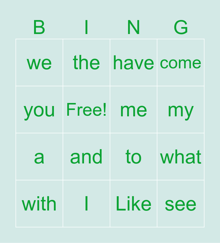 This bingo card has 16 words: I, what, have, we, a, the, to, Like, you, Free!, with, come, and, my, me and see.