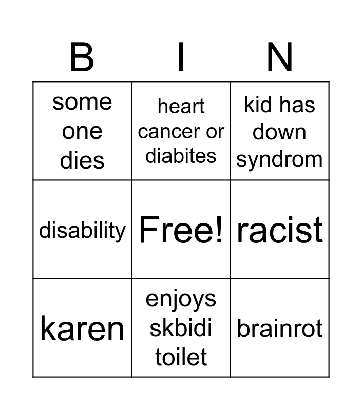 This bingo card has a free space and 8 words: racist, kid has down syndrom, heart cancer or diabites, karen, some one dies, brainrot, disability and enjoys skbidi toilet.
