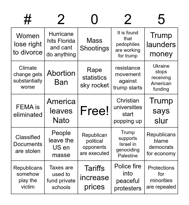 This bingo card has a free space and 24 words: People leave the US en masse, Taxes are used to fund private schools, Rape statistics sky rocket, Republicans somehow play the victim, Trump launders money, Women lose right to divorce, Climate change gets substantially worse, Hurricane hits Florida and cant do anything, Christian universities start popping up, Republican political opponents are executed, resistance movement against trump starts, FEMA is eliminated, Trump supports Israel in genociding Palestine, Republicans blame democrats for economy, Abortion Ban, Police fire into peaceful protesters, Trump says slur, Mass Shootings, Ukraine stops receiving American funding, America leaves Nato, Protections for minorities are repealed, Classified Documents are stolen, It is found that pedophiles are working for trump and Tariffs increase prices.