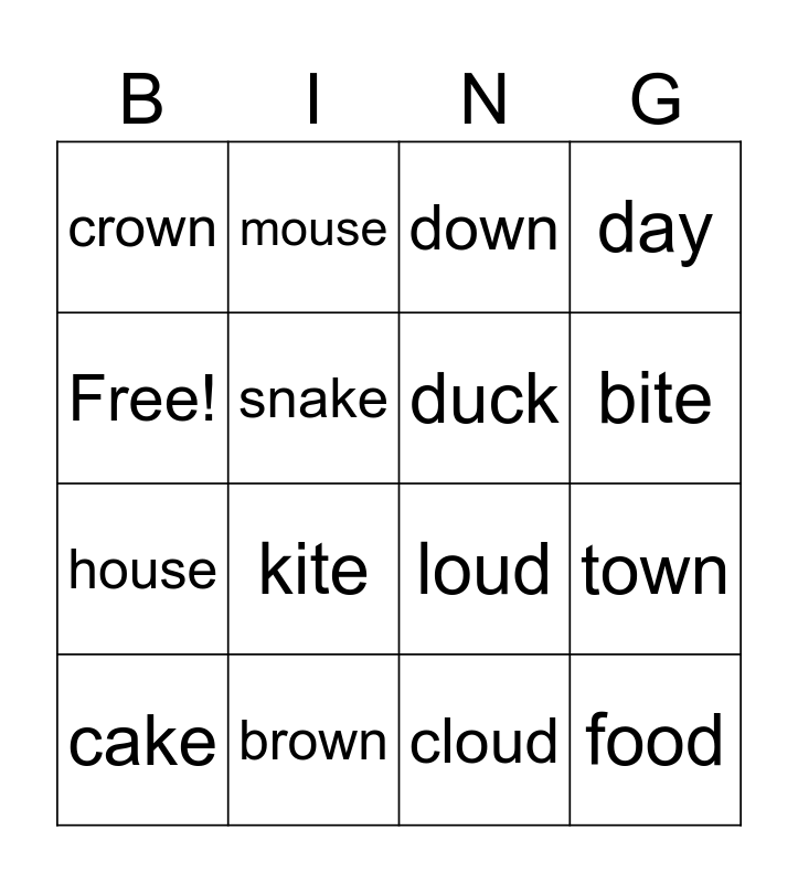 This bingo card has 16 words: brown, town, down, crown, house, mouse, loud, cloud, Free!, snake, cake, day, kite, bite, duck and food.