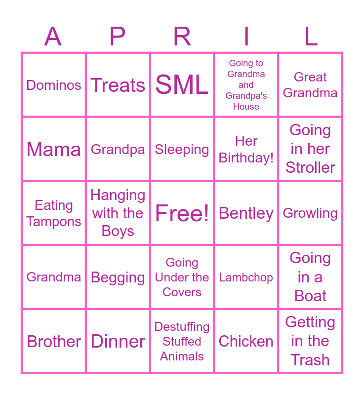 This bingo card has a free space and 34 words: Walks, Chicken, Auntie, Uncle/Boyfriend, Grandma, Grandpa, Great Grandma, Brother, Treats, Going "Bye-Bye", Sleeping, SML, Swimming, Lucy, Bentley, Going in her Stroller, Dinner, Eating Tampons, Begging, Lambchop, Going Under the Covers, Trazadone and Gabba, Dominos, Growling, Destuffing Stuffed Animals, Getting in the Trash, Going to Grandma and Grandpa's House, Being Alone, Her Birthday!, Mama, Daddy, Hanging with the Boys, Going in a Boat and Her Home.