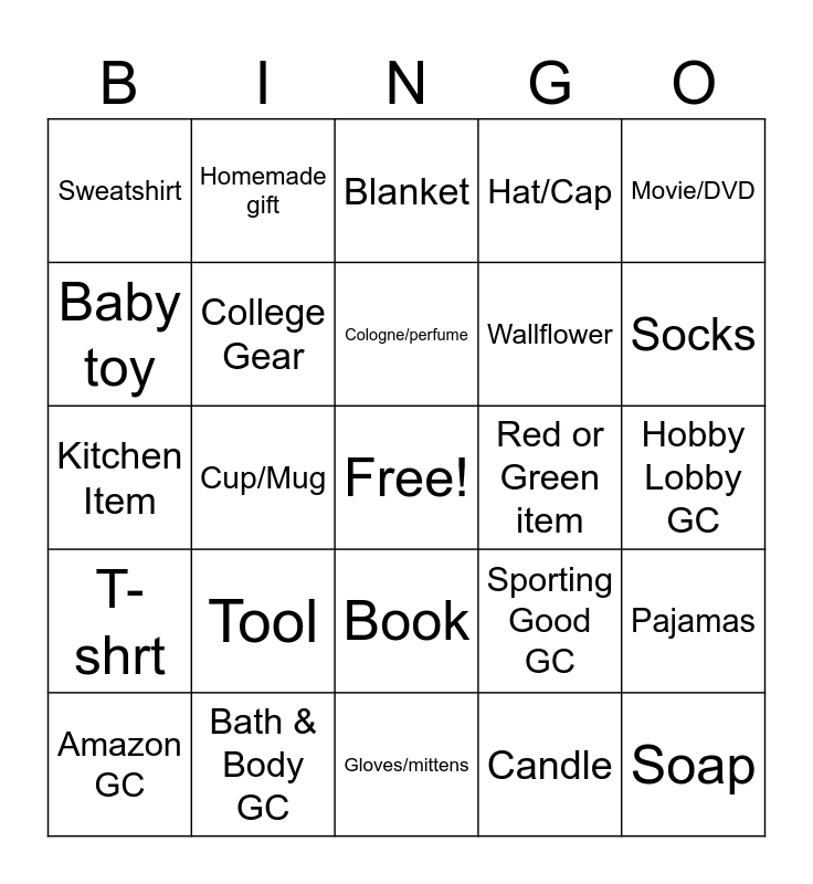 This bingo card has a free space and 29 words: Amazon GC, Pants/jeans, Cup/Mug, Michael's GC, Sweatshirt, Blanket, College Gear, Tool, Red or Green item, Bath & Body GC, Hobby Lobby GC, Soap, Gloves/mittens, Candle, Socks, Lowe's GC, Book, T-shrt, Movie/DVD, Kitchen Item, Sporting Good GC, Slipper/shoes, Wallflower, Baby toy, Hat/Cap, Homemade gift, Pajamas, Cologne/perfume and Lotion.