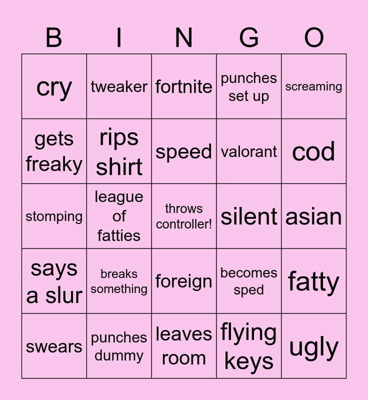 This bingo card has a free space and 24 words: swears, breaks something, speed, flying keys, screaming, cry, tweaker, fortnite, silent, asian, stomping, rips shirt, becomes sped, fatty, gets freaky, punches dummy, leaves room, punches set up, cod, says a slur, league of fatties, foreign, valorant and ugly.
