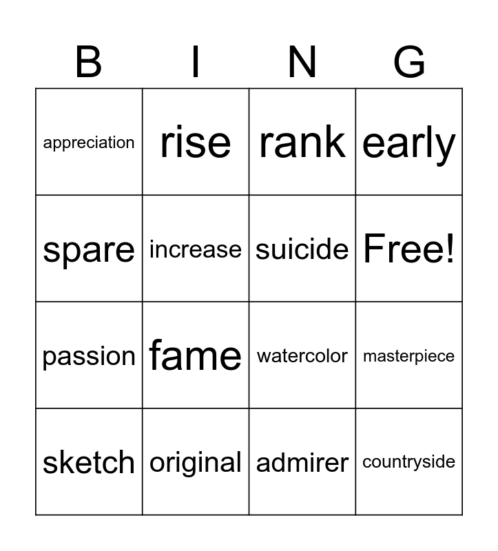 This bingo card has 17 words: admirer, sketch, rank, appreciation, fame, early, masterpiece, suicide, Free!, increase, original, watercolor, spare, rise, passion, financially and countryside.