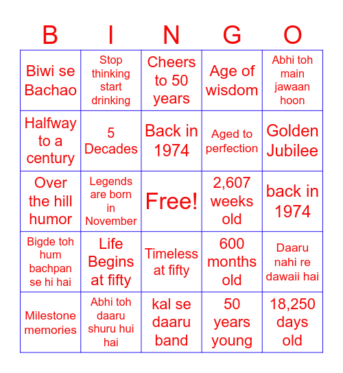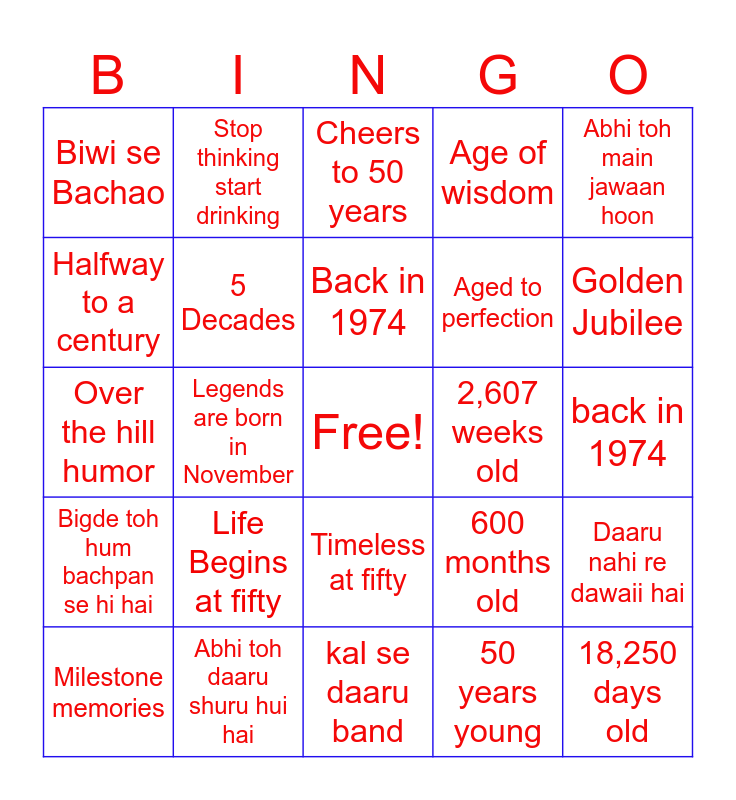 This bingo card has a free space and 24 words: Life Begins at fifty, Abhi toh daaru shuru hui hai, Back in 1974, Milestone memories, Abhi toh main jawaan hoon, Biwi se Bachao, Halfway to a century, Stop thinking start drinking, 2,607 weeks old, Timeless at fifty, Aged to perfection, Over the hill humor, 600 months old, Daaru nahi re dawaii hai, 5 Decades, 50 years young, back in 1974, Cheers to 50 years, Golden Jubilee, Legends are born in November, 18,250 days old, Bigde toh hum bachpan se hi hai, Age of wisdom and kal se daaru band.