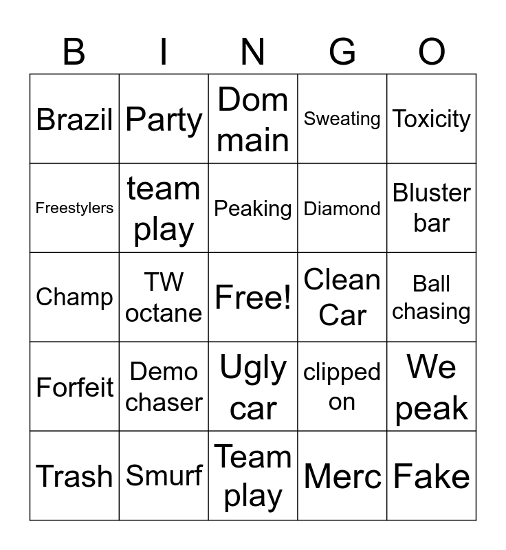 This bingo card has a free space and 24 words: Demo chaser, Smurf, Peaking, Trash, Toxicity, Brazil, Freestylers, Party, Clean Car, Ugly car, Diamond, Champ, clipped on, We peak, team play, Merc, Ball chasing, Dom main, Bluster bar, TW octane, Fake, Forfeit, Sweating and Team play.