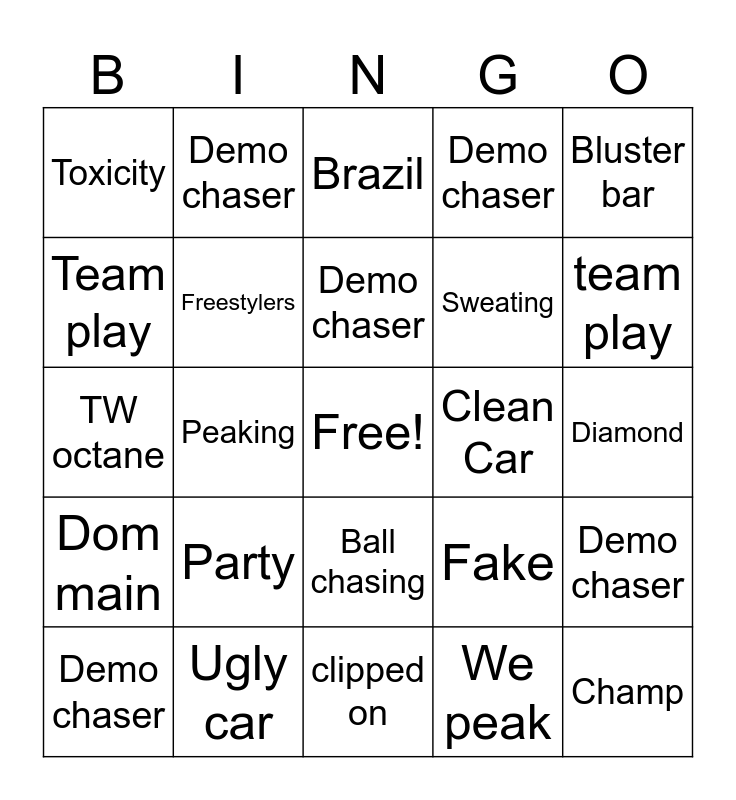 This bingo card has a free space and 29 words: Demo chaser, Smurf, Peaking, Trash, Toxicity, Brazil, Freestylers, Party, Clean Car, Ugly car, Diamond, Champ, clipped on, We peak, team play, Merc, Ball chasing, Dom main, Bluster bar, TW octane, Fake, Forfeit, Sweating, Team play, Demo chaser, Demo chaser, Demo chaser, Demo chaser and Demo chaser.