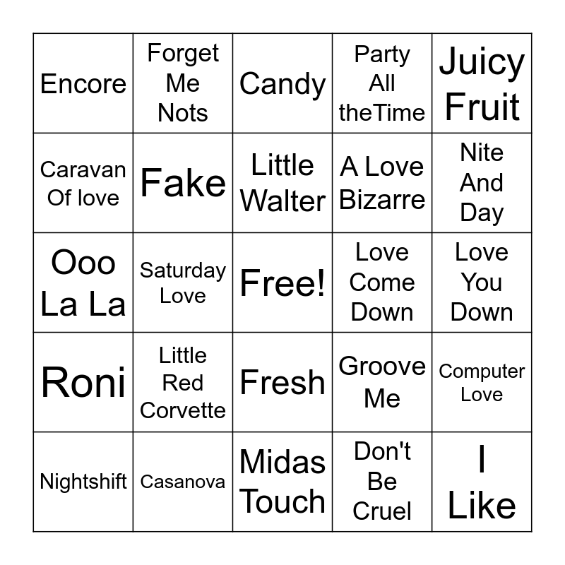 This bingo card has a free space and 24 words: Little Red Corvette, Casanova, Little Walter, Nightshift, Juicy Fruit, Encore, Caravan Of love, Forget Me Nots, Love Come Down, Fresh, A Love Bizarre, Ooo La La, Groove Me, Computer Love, Fake, Don't Be Cruel, Love You Down, Candy, Nite And Day, Saturday Love, I Like, Roni, Party All theTime and Midas Touch.