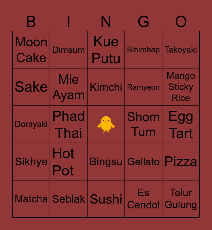 This bingo card has a free space and 24 words: Hot Pot, Seblak, Kimchi, Matcha, Takoyaki, Moon Cake, Sake, Dimsum, Shom Tum, Bingsu, Ramyeon, Dorayaki, Gellato, Pizza, Mie Ayam, Es Cendol, Egg Tart, Kue Putu, Mango Sticky Rice, Phad Thai, Telur Gulung, Sikhye, Bibimbap and Sushi.