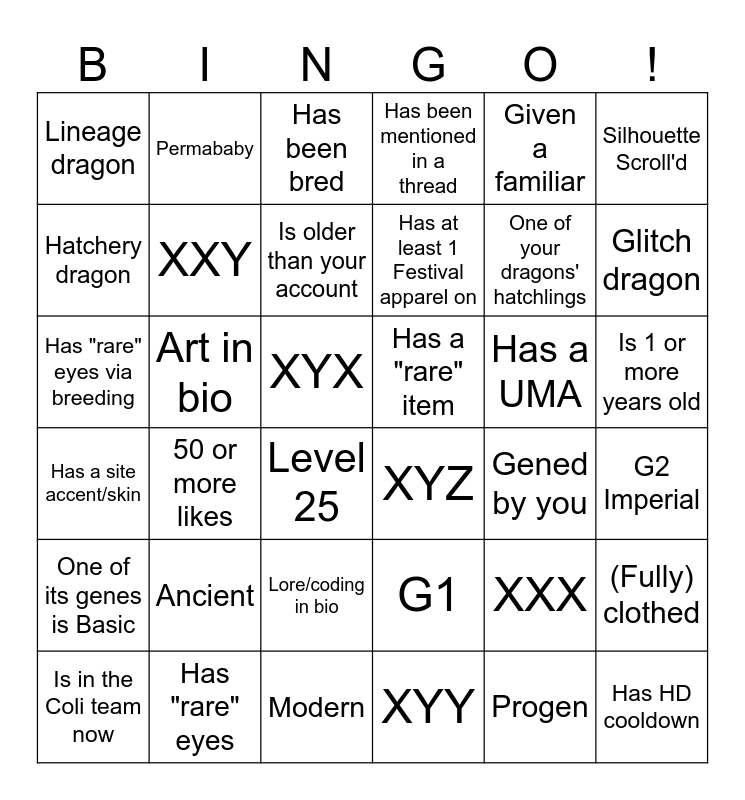 This bingo card has 36 words: G1, Lore/coding in bio, XYY, Hatchery dragon, Has a site accent/skin, Has a "rare" item, XXY, Modern, Given a familiar, XXX, Glitch dragon, Has been mentioned in a thread, (Fully) clothed, Art in bio, Has at least 1 Festival apparel on, Lineage dragon, One of its genes is Basic, Has a UMA, Has "rare" eyes via breeding, Has been bred, XYX, 50 or more likes, XYZ, Level 25, Gened by you, Permababy, One of your dragons' hatchlings, Has "rare" eyes, Is older than your account, Silhouette Scroll'd, Has HD cooldown, Is in the Coli team now, G2 Imperial, Is 1 or more years old, Ancient and Progen.