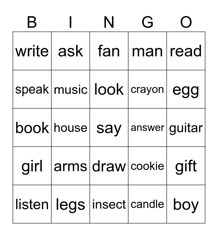 This bingo card has a free space and 24 words: arms, legs, look, listen, read, write, speak, ask, answer, draw, crayon, book, cookie, gift, music, candle, guitar, fan, egg, house, boy, girl, man and insect.