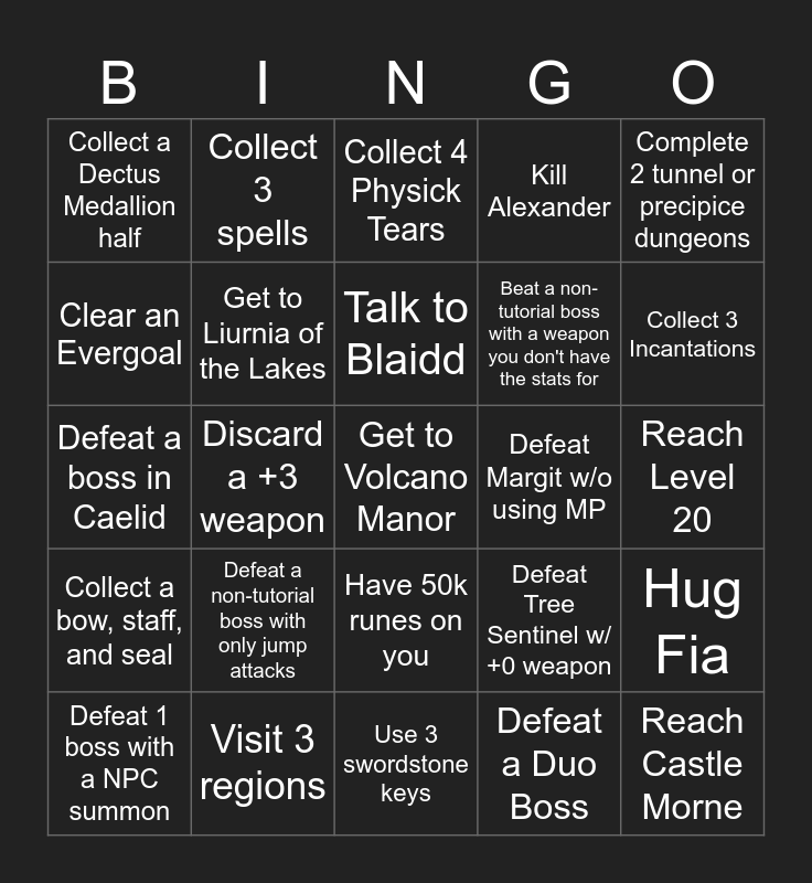 This bingo card has 25 words: Defeat a non-tutorial boss with only jump attacks, Use 3 swordstone keys, Talk to Blaidd, Defeat 1 boss with a NPC summon, Complete 2 tunnel or precipice dungeons, Collect a Dectus Medallion half, Clear an Evergoal, Collect 3 spells, Defeat Margit w/o using MP, Have 50k runes on you, Beat a non-tutorial boss with a weapon you don't have the stats for, Defeat a boss in Caelid, Defeat Tree Sentinel w/ +0 weapon, Hug Fia, Get to Liurnia of the Lakes, Reach Castle Morne, Reach Level 20, Collect 4 Physick Tears, Collect 3 Incantations, Discard a +3 weapon, Get to Volcano Manor, Visit 3 regions, Collect a bow, staff, and seal, Kill Alexander and Defeat a Duo Boss.