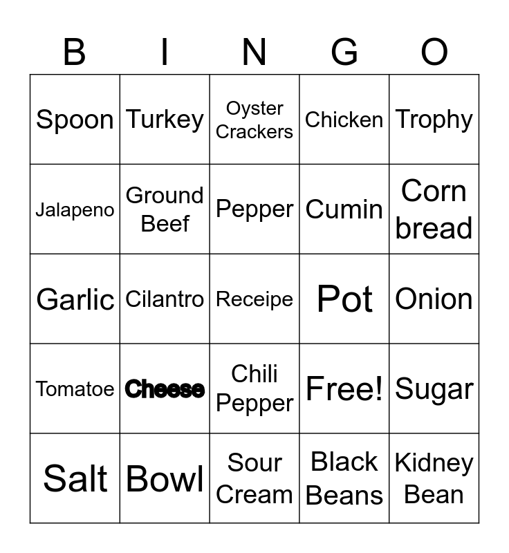 This bingo card has 25 words: Cheese, Sour Cream, Pepper, Salt, Trophy, Spoon, Jalapeno, Turkey, Pot, Chili Pepper, Cumin, Garlic, Free!, Sugar, Ground Beef, Kidney Bean, Onion, Oyster Crackers, Corn bread, Cilantro, Receipe, Bowl, Tomatoe, Chicken and Black Beans.