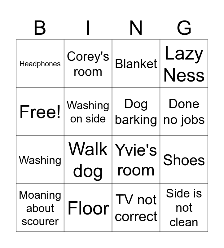 This bingo card has 16 words: Floor, Shoes, Blanket, Headphones, Washing, Corey's room, Yvie's room, TV not correct, Free!, Washing on side, Moaning about scourer, Lazy Ness, Walk dog, Done no jobs, Dog barking and Side is not clean.