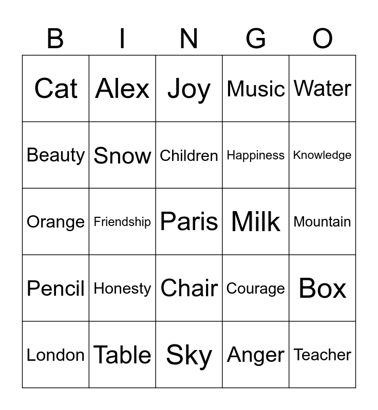 This bingo card has a free space and 24 words: Honesty, Table, Children, London, Water, Cat, Beauty, Alex, Milk, Chair, Happiness, Orange, Courage, Box, Snow, Anger, Mountain, Joy, Knowledge, Friendship, Teacher, Pencil, Music and Sky.