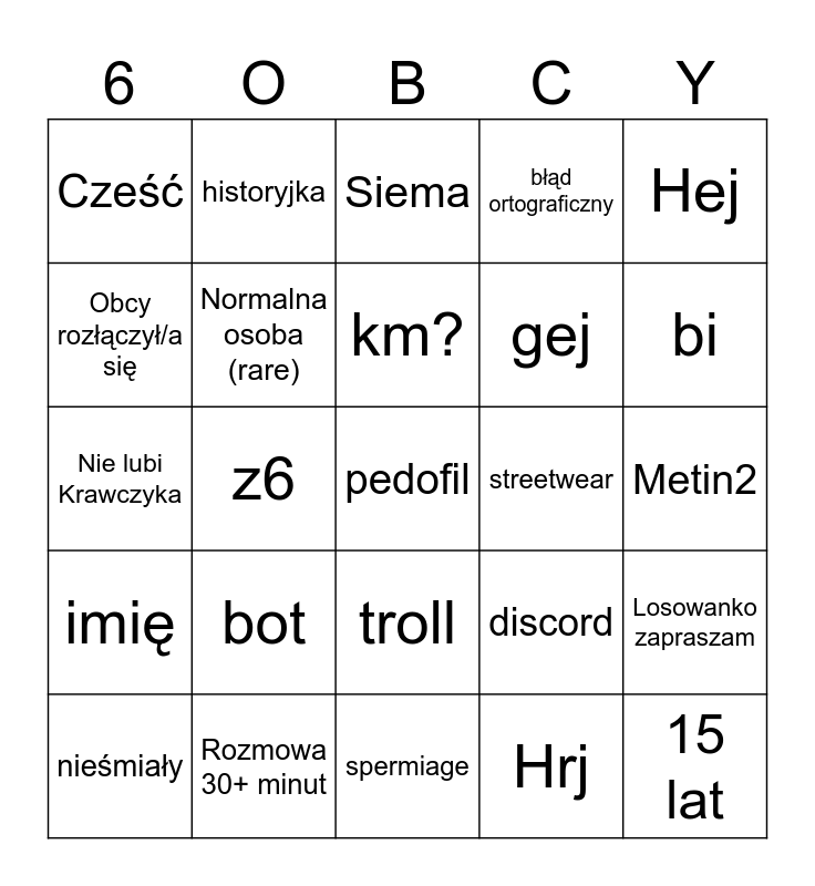 This bingo card has a free space and 25 words: bot, spermiage, km?, nieśmiały, Hej, Cześć, Obcy rozłączył/a się, historyjka, streetwear, troll, gej, Nie lubi Krawczyka, discord, Losowanko zapraszam, Normalna osoba (rare), rozmowa 5s, Metin2, Siema, bi, z6, 15 lat, Rozmowa 30+ minut, imię, błąd ortograficzny and Hrj.