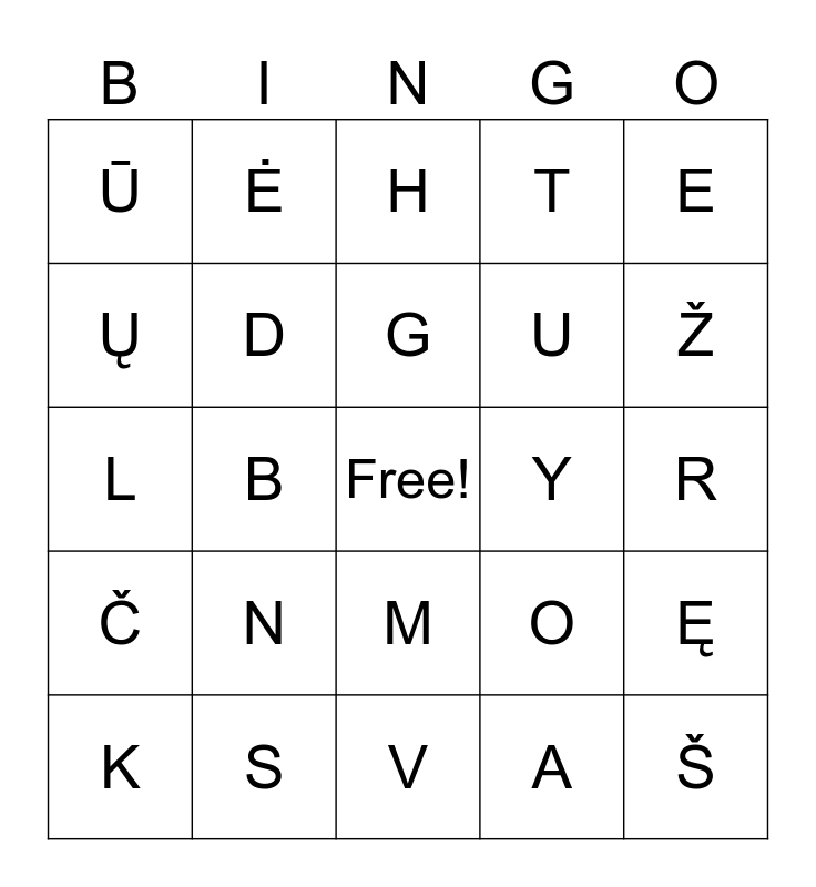 This bingo card has a free space and 32 words: A, Ą, B, C, Č, D, E, Ę, Ė, F, G, H, I, Į, Y, J, K, L, M, N, O, P, R, S, Š, T, U, Ų, Ū, V, Z and Ž.
