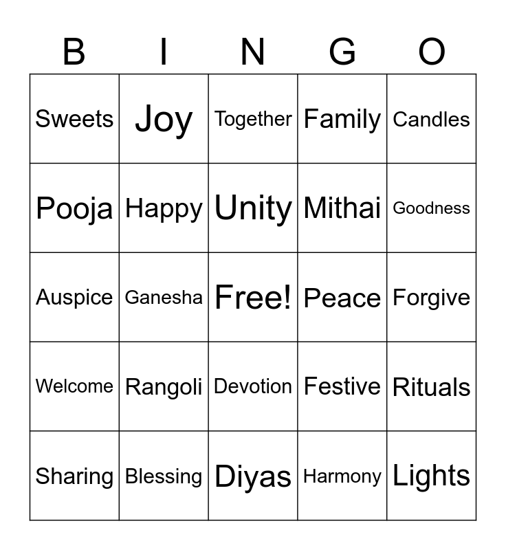 This bingo card has a free space and 50 words: Diwali, Lights, Lamps, Diyas, Rangoli, Colors, Joy, Bless, Pooja, Wealth, Happy, Family, Rituals, Festive, Gifts, Fasting, Unity, Peace, Love, Candles, Ganesha, Harmony, Sweets, Mithai, Culture, Victory, Goodness, Renewal, Together, Devotion, New Year, Spirit, Triumph, Fortune, Blessing, Purity, Joyous, Prayer, Hope, Forgive, Friends, Success, Festival, Serenity, Sharing, Auspice, Wishes, Cleanse, Welcome and Sacred.