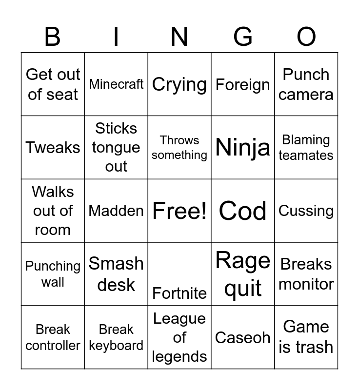 This bingo card has a free space and 24 words: Smash desk, Break keyboard, Throws something, Break controller, Punch camera, Get out of seat, Tweaks, Minecraft, Cod, Fortnite, Ninja, Walks out of room, Rage quit, Breaks monitor, Sticks tongue out, Caseoh, Cussing, Crying, Blaming teamates, Madden, Game is trash, Punching wall, Foreign and League of legends.