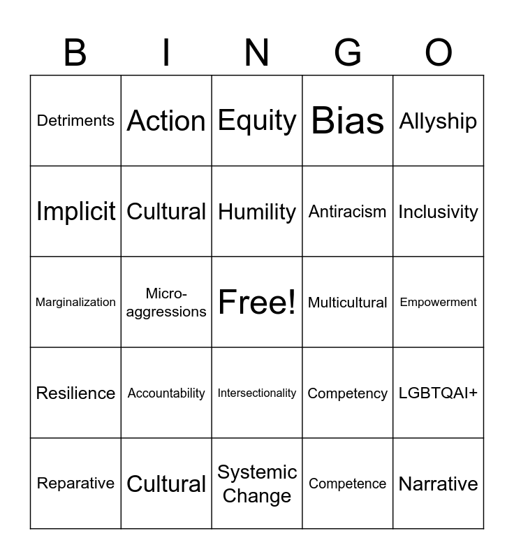 This bingo card has a free space and 31 words: Systemic Change, Privilege, Micro-aggressions, Social, Detriments, Equity, Cultural, Competency, Multicultural, Competence, Empowerment, Narrative, Change, Empathy, Inclusivity, Transformative Justice, LGBTQAI+, Accountability, Resilience, Intersectionality, Allyship, Accessibility, Reparative, Action, Antiracism, Implicit, Bias, Marginalization, Cultural, Humility and Human Rights.
