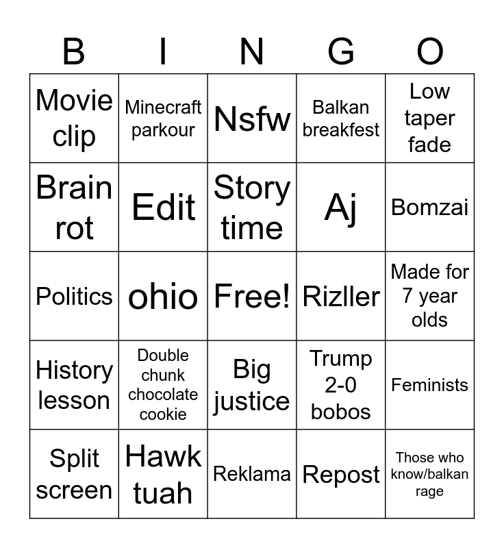 This bingo card has a free space and 24 words: Double chunk chocolate cookie, Hawk tuah, Story time, Split screen, Low taper fade, Movie clip, Brain rot, Minecraft parkour, Rizller, Big justice, Aj, Politics, Trump 2-0 bobos, Feminists, Edit, Repost, Made for 7 year olds, Nsfw, Bomzai, ohio, Those who know/balkan rage, History lesson, Balkan breakfest and Reklama.