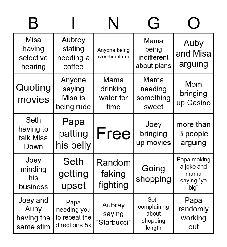 This bingo card has a free space and 24 words: Seth getting upset, Papa needing you to repeat the directions 5x, Mama drinking water for time, Joey and Auby having the same stim, Auby and Misa arguing, Misa having selective hearing, Quoting movies, Aubrey stating needing a coffee, Joey bringing up movies, Random faking fighting, Mama needing something sweet, Seth having to talk Misa Down, Going shopping, Papa making a joke and mama saying "ya big", Anyone saying Misa is being rude, Seth complaining about shopping length, more than 3 people arguing, Anyone being overstimulated, Mom bringing up Casino, Papa patting his belly, Papa randomly working out, Joey minding his business, Mama being indifferent about plans and Aubrey saying "Starbucci".