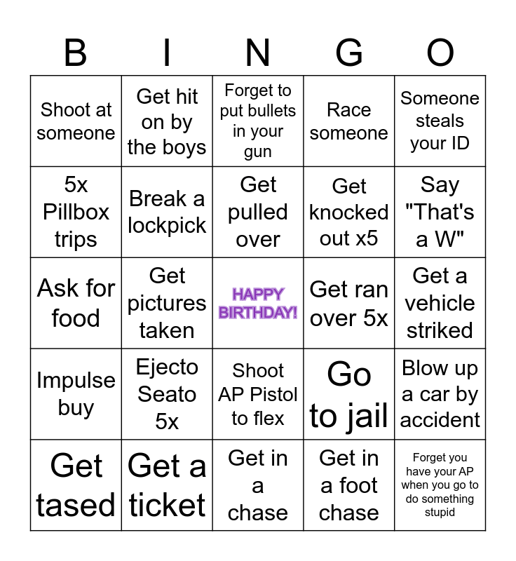 This bingo card has a free space and 24 words: Ejecto Seato 5x, Get a ticket, Get pulled over, Get tased, Someone steals your ID, Shoot at someone, 5x Pillbox trips, Get hit on by the boys, Get ran over 5x, Shoot AP Pistol to flex, Get knocked out x5, Ask for food, Go to jail, Blow up a car by accident, Break a lockpick, Get in a foot chase, Get a vehicle striked, Forget to put bullets in your gun, Say "That's a W", Get pictures taken, Forget you have your AP when you go to do something stupid, Impulse buy, Race someone and Get in a chase.