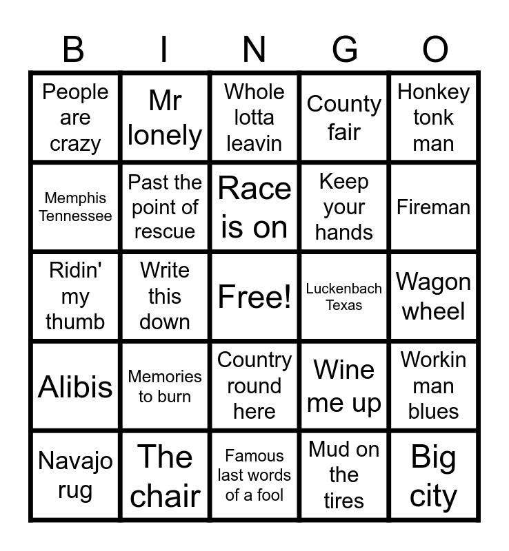 This bingo card has a free space and 52 words: Jacob's ladder, Big city, Chattahoochee, Famous last words of a fool, Memories to burn, Who's cheatin' who, Mr lonely, Amarillo, Memphis Tennessee, Seminole wind, Past the point of rescue, All about tonight, Workin man blues, Wine me up, Texas and 1880, Dirt cheap, Race is on, Luckenbach Texas, Old time, Honkey tonk man, Write this down, Mud on the tires, People are crazy, Keep your hands, The blues man, T.R.O.U.B.L.E, Should of been a cowboy, Mister Bojangles, Fireman, Be my baby tonight, Don't rock the jukebox, County fair, Cowboy ridin' away, Moma tried, Rose colored glasses, Whole lotta leavin, The chair, It matters to her, Ace in the whole, Red necked girl, Much too young, Wagon wheel, Alibis, Fast as you, Country round here, Johnny B Goode, In color, Ridin' my thumb, Lay down Sally, Troubadour, Navajo rug and Tulsa time.