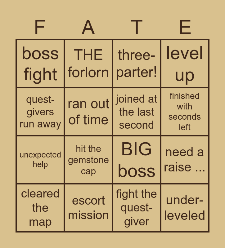 This bingo card has 24 words: nothing bad will happen, fetch quest, finished with seconds left, forlorn maiden, quest-givers run away, boss fight, ran out of time, THE forlorn, escort mission, SO many guys, unexpected help, BIG boss, quest-givers caused this., two-parter, joined at the last second, two twists in a row, fight the quest-giver, three-parter!, hit the gemstone cap, need a raise ..., cleared the map, under-leveled, level up and safety up!.