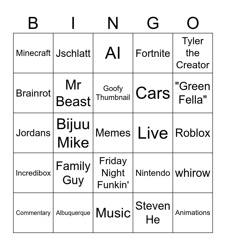This bingo card has a free space and 39 words: Weezer, Baldi, KSI, Mr Beast, Commentary, Friday Night Funkin', Goofy Thumbnail, 'Predator', Tyler the Creator, Incredibox, Bijuu Mike, Fortnite, Animations, Roblox, Live, Family Guy, Discord, Minecraft, 'Laugh you Lose', Nintendo, Brainrot, Music, Cars, "Green Fella", DanTDM, British, Rumble Pack People, Clickbait, ThemePark, Jschlatt, IShow Speed, Console, AI, Albuquerque, Steven He, Marvel, whirow, Jordans and Sonic.