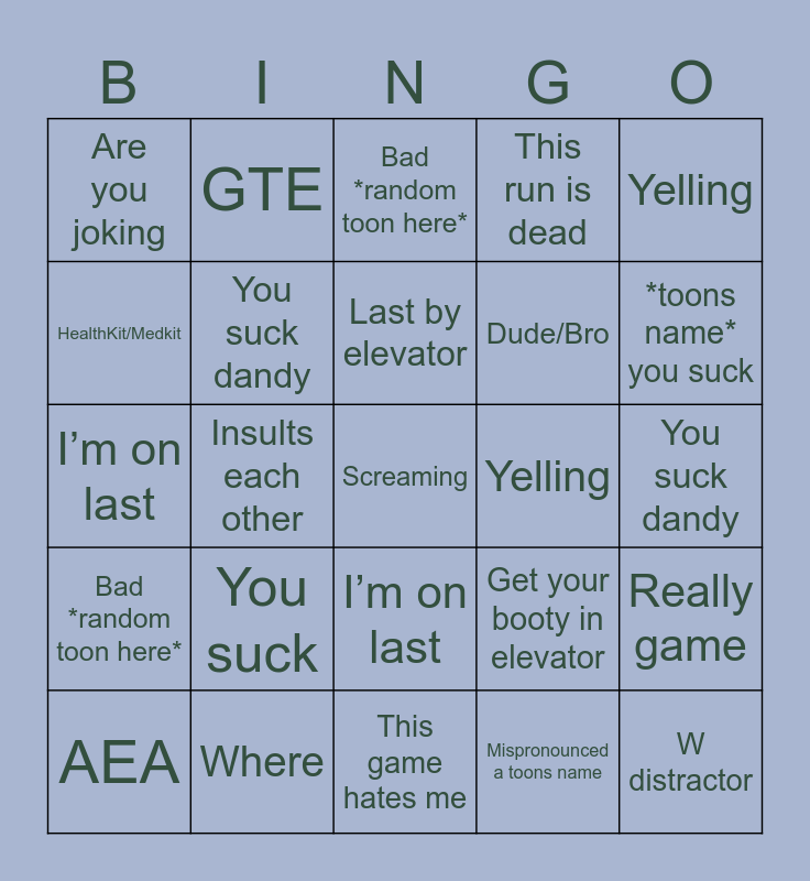 This bingo card has a free space and 67 words: Free!, Who got hit, W distractor, Really game, Distractor is extracting, Give me that, GTE, AEA, Last by elevator, Get your booty in elevator, I’m on last, Insults a toodles, You suck dandy, Yelling, Bandage, HealthKit/Medkit, Insults each other, Are you joking, Where, Dude/Bro, You suck, Bad *random toon here*, This run is dead, Mispronounced a toons name, Insults pets, No mains please, This game hates me, *toons name* bro, *toons name* you suck, Who got hit, W distractor, Really game, Distractor is extracting, Give me that, GTE, AEA, Last by elevator, Get your booty in elevator, I’m on last, Insults a toodles, Screaming, You suck dandy, Yelling, Bandage, HealthKit/Medkit, Insults each other, Are you joking, Where, Dude/Bro, You suck, Bad *random toon here*, This run is dead, Mispronounced a toons name, Insults pets, No mains please, This game hates me, *toons name* bro, *toons name* you suck, Game crashes, Get juked, Complains about kitchen, Found Rodger, I’m better 😎, You’re trash kid, Aiden your trinkets suck, W *character name.* and Aiden shut up.