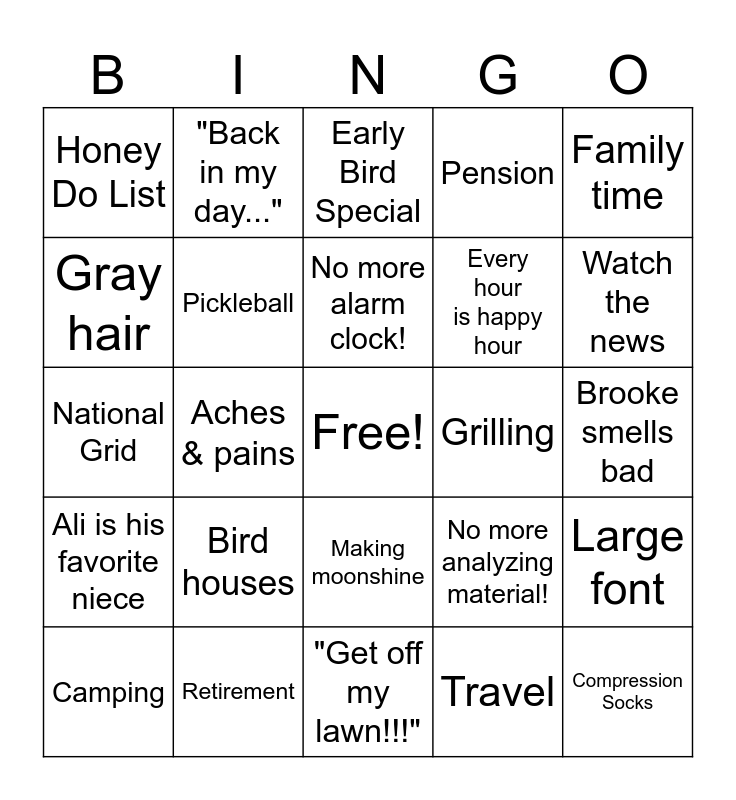 This bingo card has a free space and 28 words: Large font, Yard work, Every hour is happy hour, Travel, Gray hair, Early Bird Special, "Back in my day...", Ali is his favorite niece, Grilling, Camping, National Grid, Pension, Retirement, "Get off my lawn!!!", Watch the news, TWU Local 101, Bird houses, Pickleball, No more alarm clock!, Making moonshine, Honey Do List, Sleeping in, Compression Socks, Aches & pains, Brooke smells bad, No more analyzing material!, Family time and He earned it!.