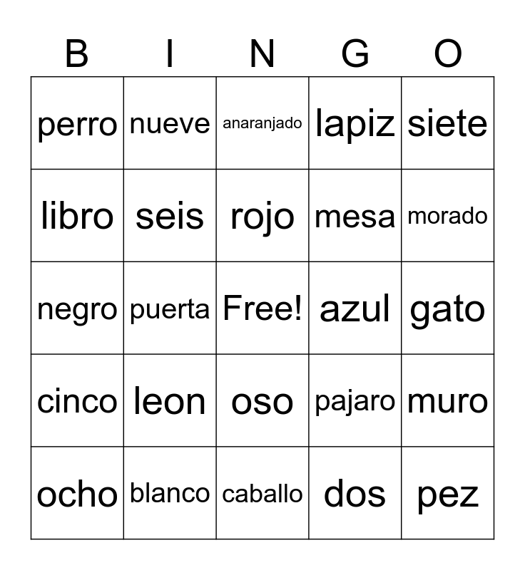 This bingo card has a free space and 34 words: uno, dos, tres, cuatro, cinco, seis, siete, ocho, nueve, diez, rojo, anaranjado, amarillo, verde, azul, morado, blanco, negro, leon, pajaro, oso, elefante, perro, gato, caballo, pez, lapiz, silla, mesa, libro, casa, puerta, muro and ventana.